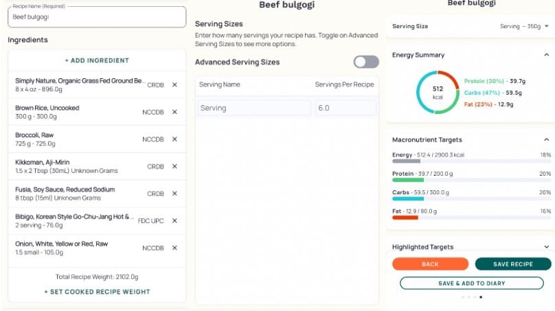Beef Bulgogi: The recipe in the video doesn’t include rice. Check out the screenshots below to see what I did for my meals and the calorie breakdown.